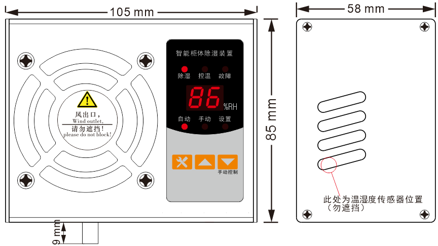 2、自動(dòng)運(yùn)行與手動(dòng)除濕功能切換、溫度啟動(dòng)值和除濕啟動(dòng)值可調(diào);